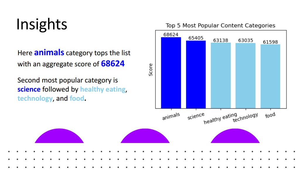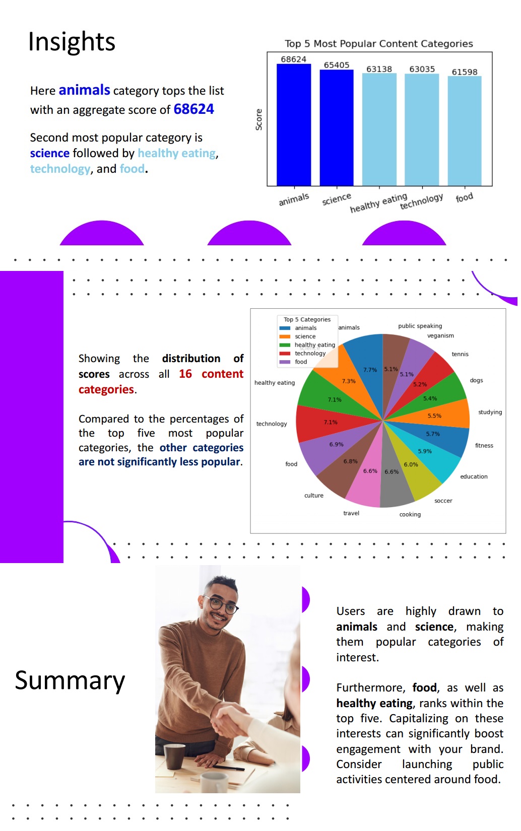 The final analysis identified the top 5 content categories, visualized through bar plots and