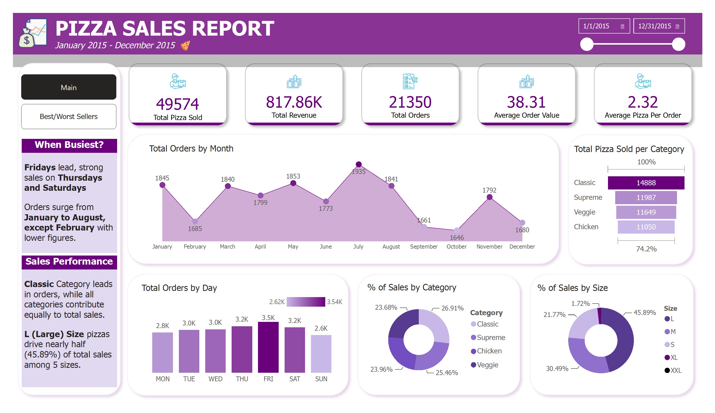 Analyzed sales data from January to December 2015, featuring pizzas of various sizes and categories.